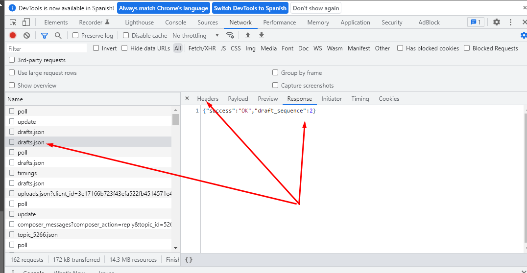 and on each request, you can actually see the what was requested and what was the response, from there you can see what’s failing, here you can see a successful response, in your case you should see some sort of error