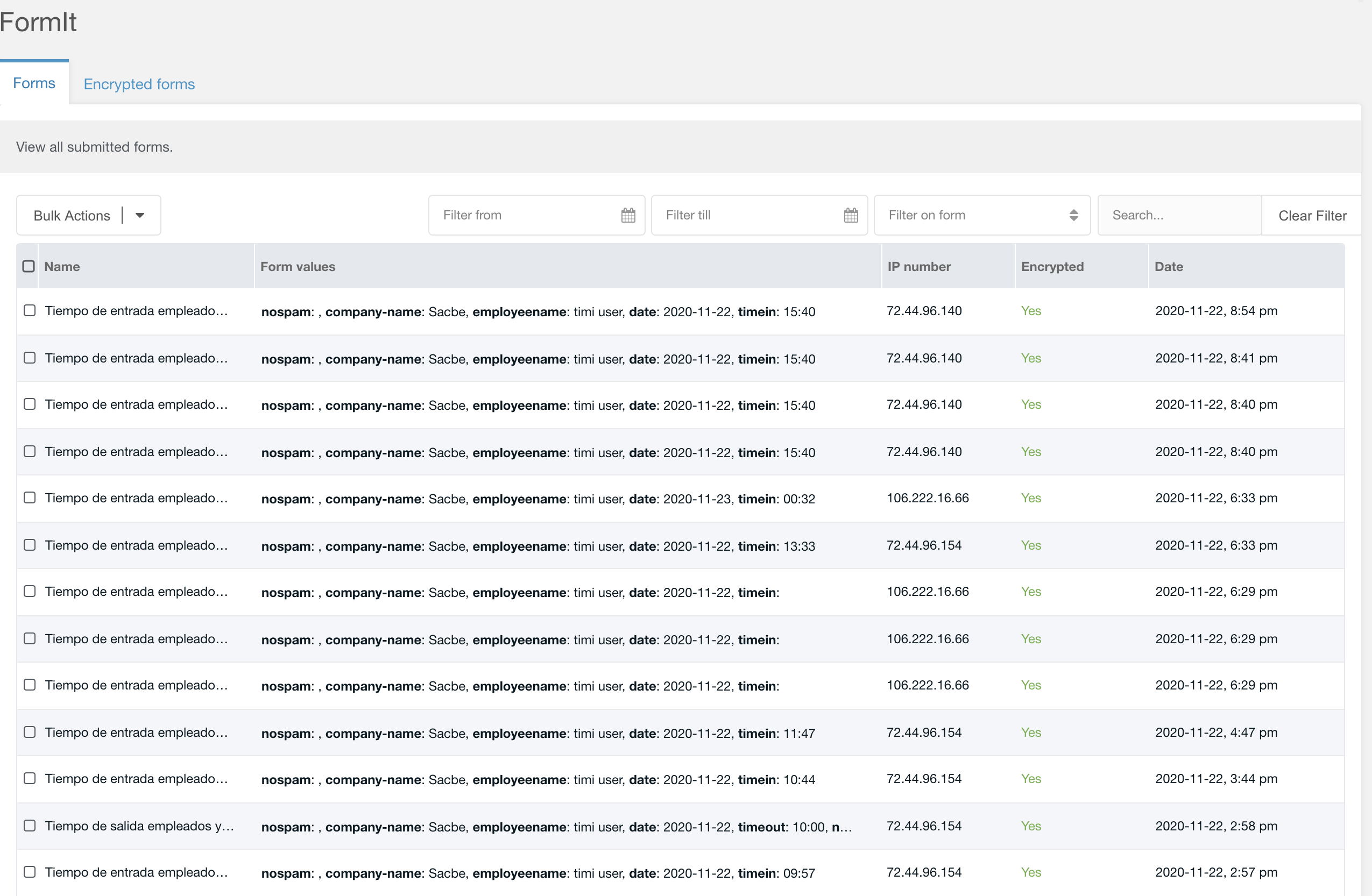 The table “modx_formit_forms” has no column ‘company-name’ and no column ‘time’. So $rows['company-name'] and $rows['time'] won’t return anything.
