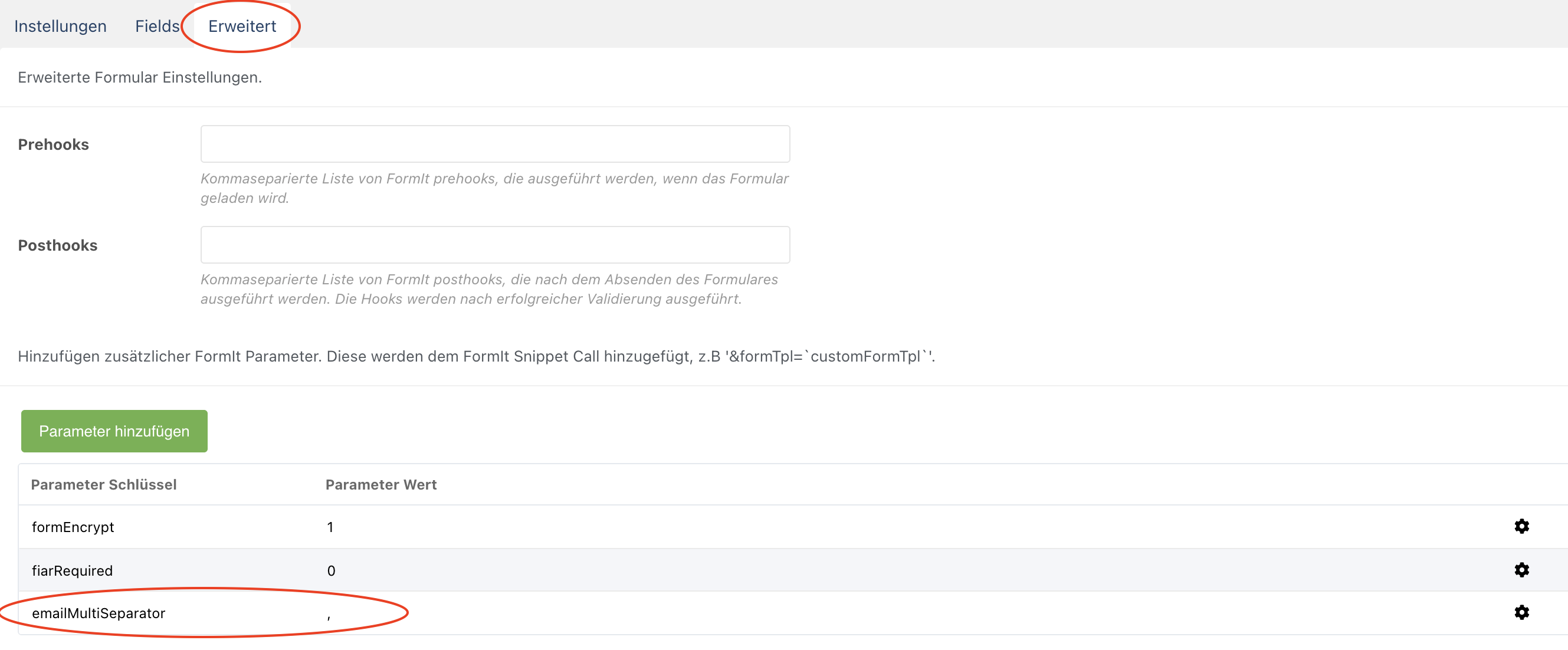 In the Formalicious form → tab “Advanced Settings”, there is a section where you can add parameters (“Here you can add FormIt parameters. These parameters will be added to the FormIt snippet call…”).