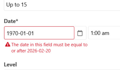 I tried to reproduce the issue by using the same settings you detailed above ( “Default Date and Time” = Today (midnight), “Earliest Date” = 20.02.2026, “Allow blank” = No).