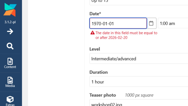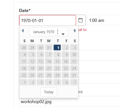 Emptying the cache in the core folder on the server also does not fix the problem. We remain with an autopopulated 1970 date and the red error telling us that 1970 is prior to the earliest permitted date fixed in the TV input settings.
